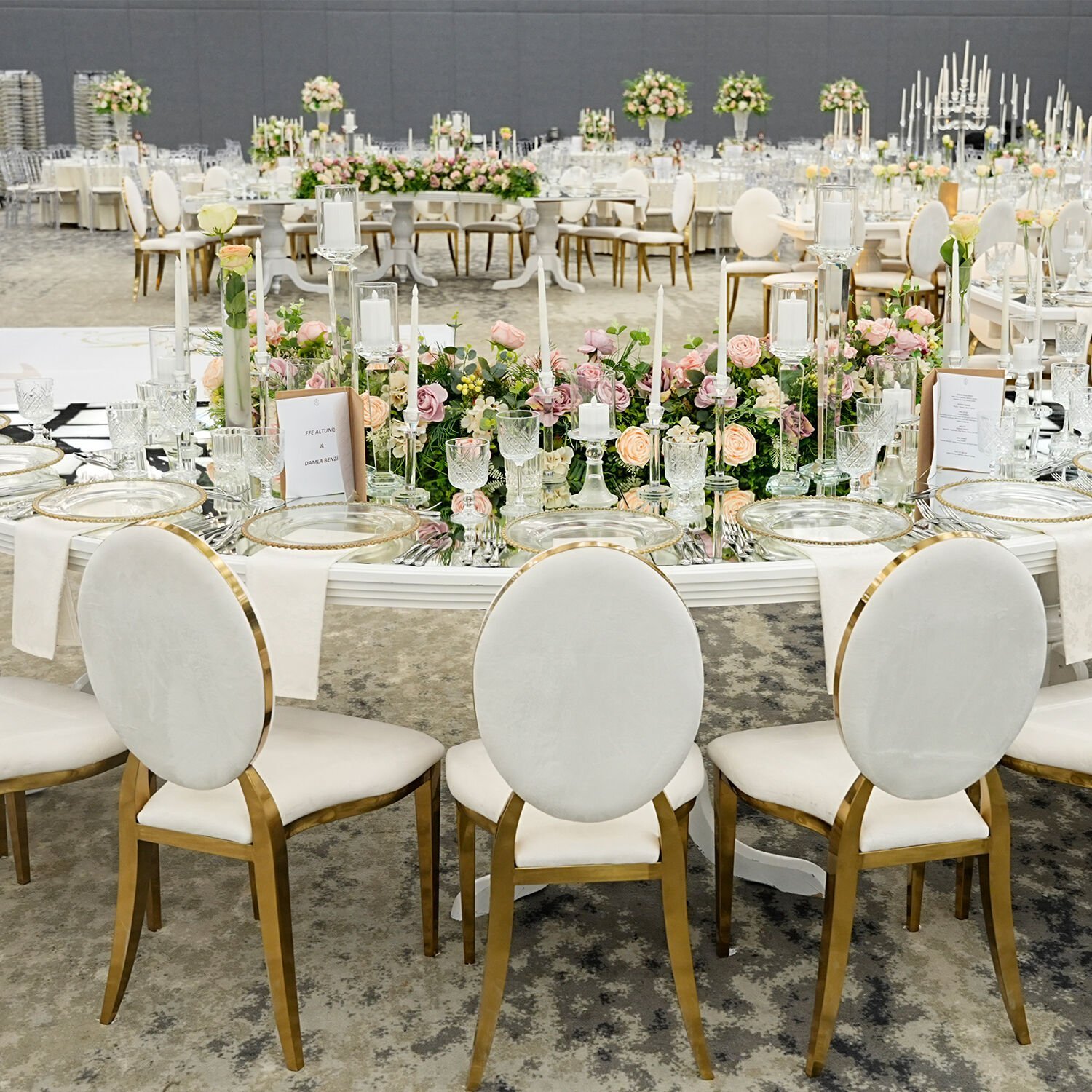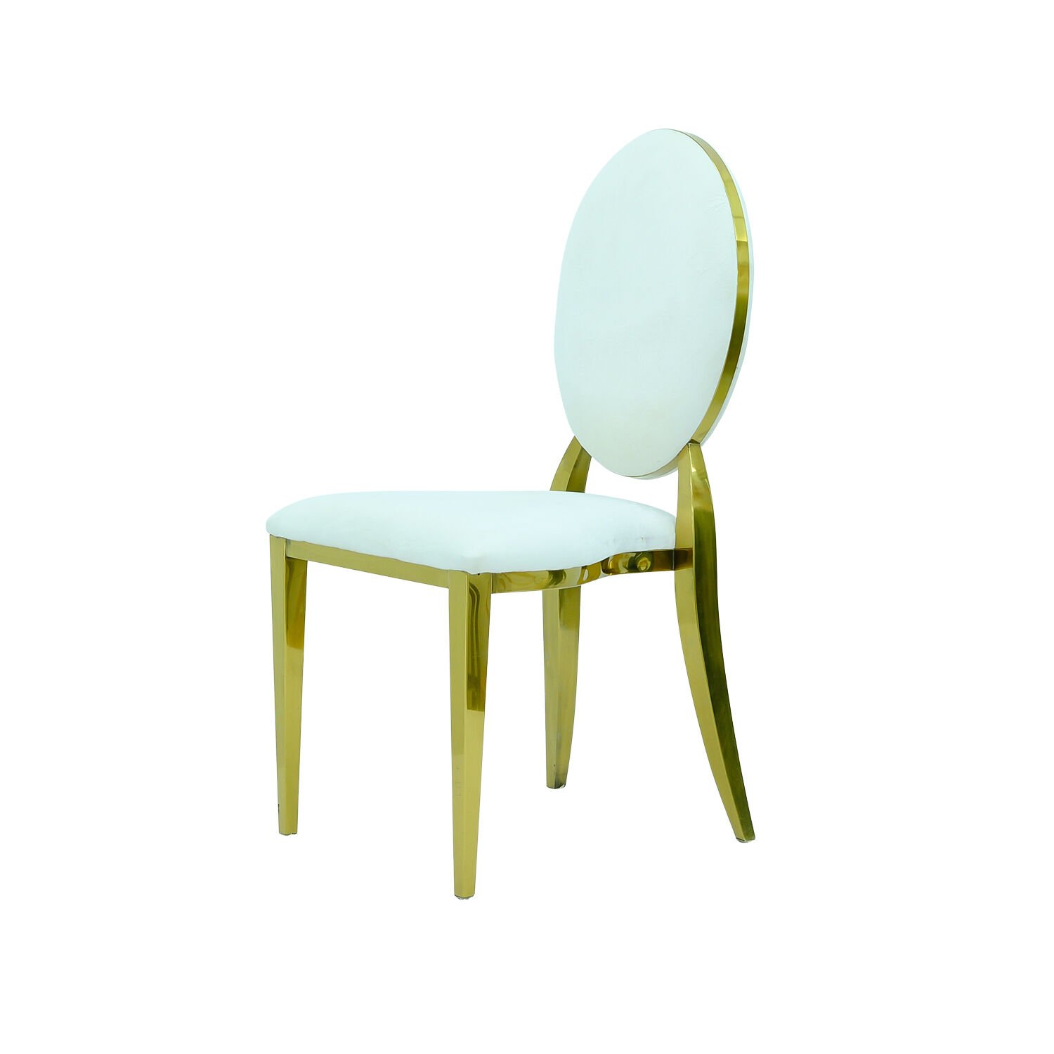 Beyaz renk seçeneği,Dior Gold Sandalye’nin en çok tercih edilen versiyonudur. Düğün organizasyonlarında saflığı, ferahlığı ve zarafeti temsil eden beyaz renk; masa, çiçek ve dekoratif aksesuarlarla kusursuz bir uyum sağlar. Mekâna aydınlık ve prestijli bir görünüm kazandırır.