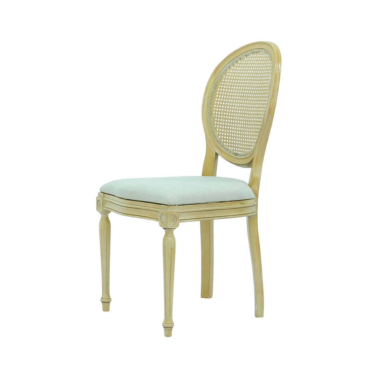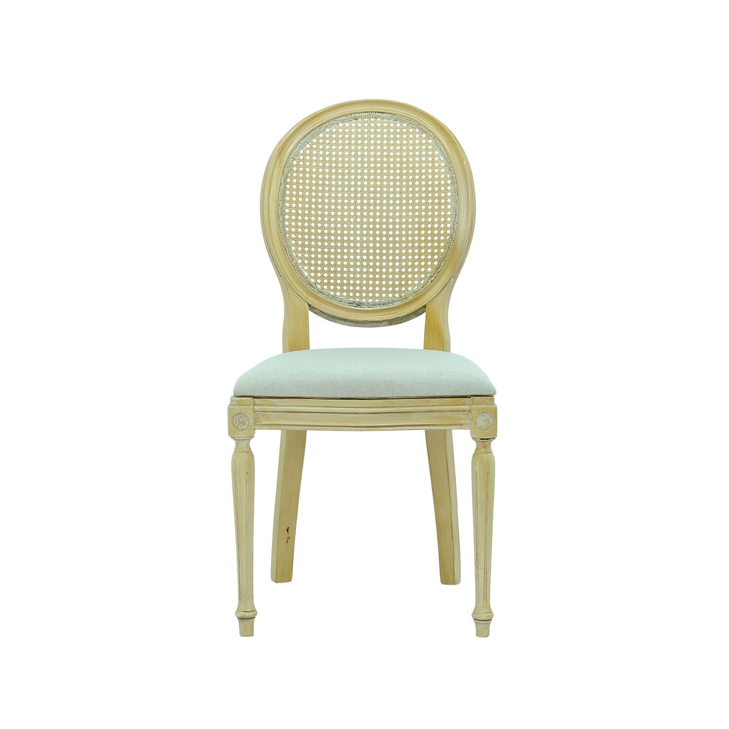Sandalyenin sırt kısmında yer alan hasır dokulu yüzey, klasik madalyon formunu hafif ve doğal bir görünümle tamamlar. Bu detay, sandalyeyi hem klasik hem de modern düğün konseptleri için uygun hale getirir. Oturum bölümü döşemeli ve sünger desteklidir; bu sayede davetlilere organizasyon boyunca konforlu bir oturma deneyimi sunar. Kiralama organizasyonlarında hijyen ve kullanım kolaylığı büyük önem taşıdığından, minder yüzeyi kolay temizlenebilir malzemeden üretilmiştir.