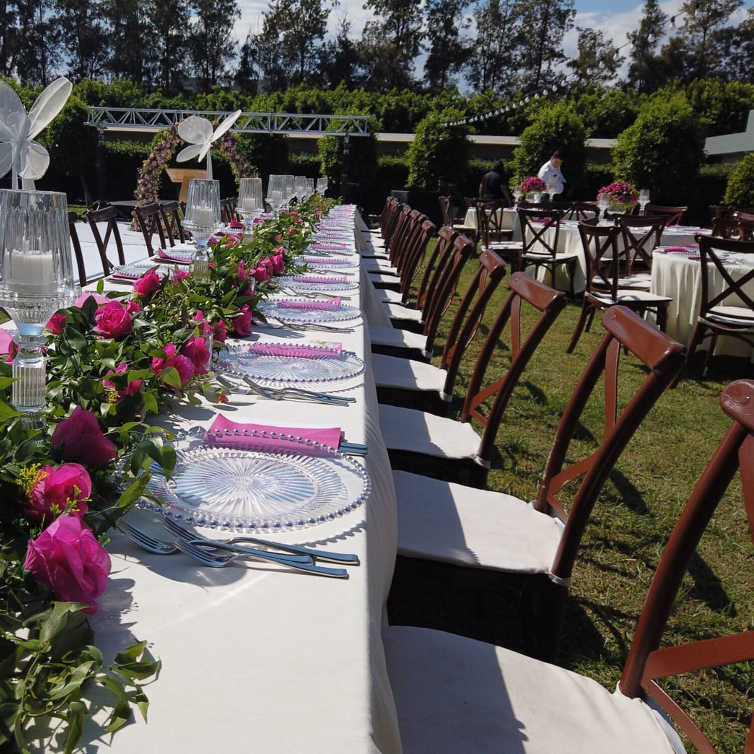 Masif ahşap gövdeden üretilmiş olan Cross Back sandalyeler, rustik ve bohem konseptlerin estetik anlayışını yansıtır. Ahşabın doğal dokusu, yeşil alanlar, bahçeler, kır düğünü mekânları ve açık hava organizasyonlarıyla kusursuz bir uyum sağlar. Gösterişten uzak ama detaylarıyla fark yaratan bu model, özellikle fotoğraf ve video çekimlerinde mekâna sıcak ve samimi bir atmosfer kazandırır.
