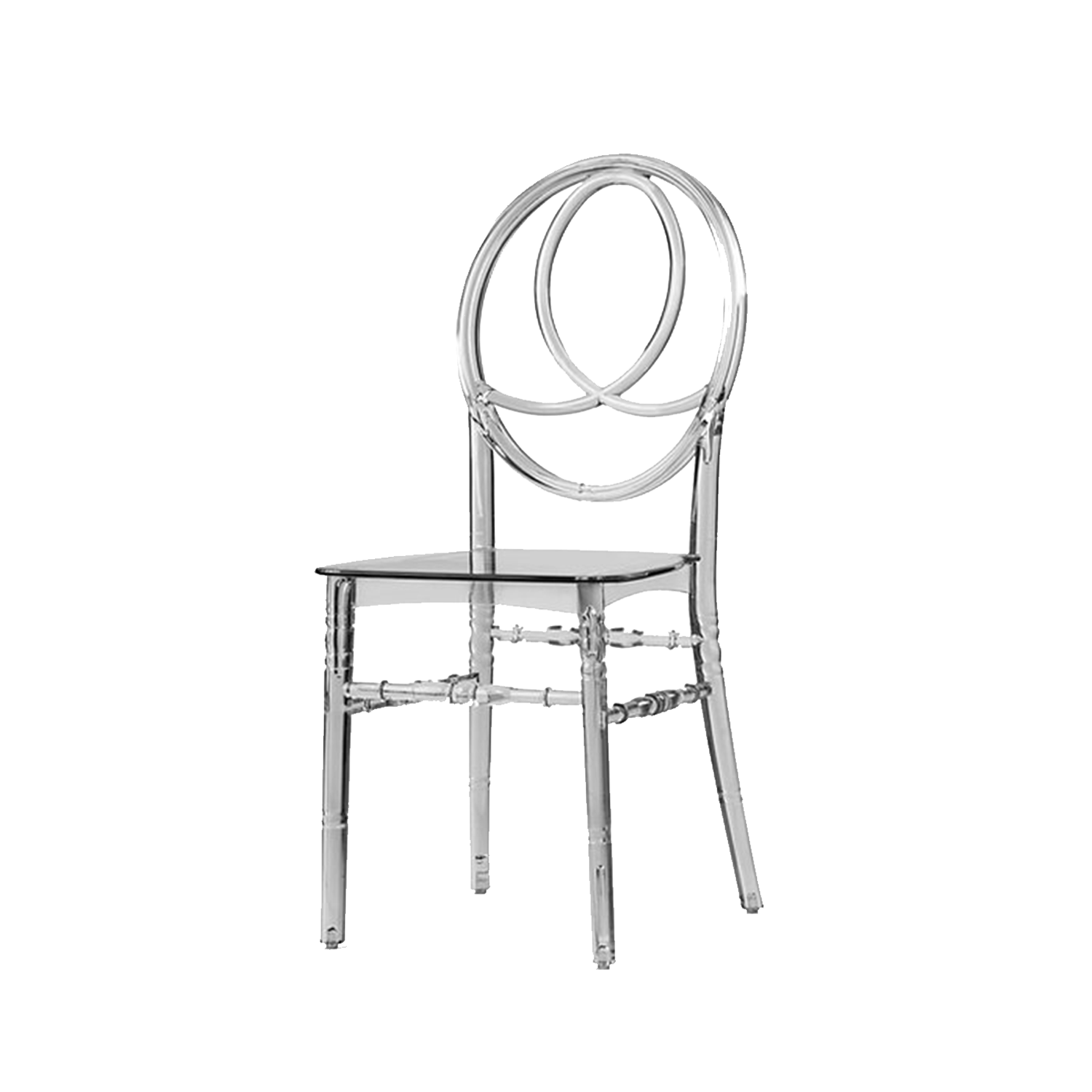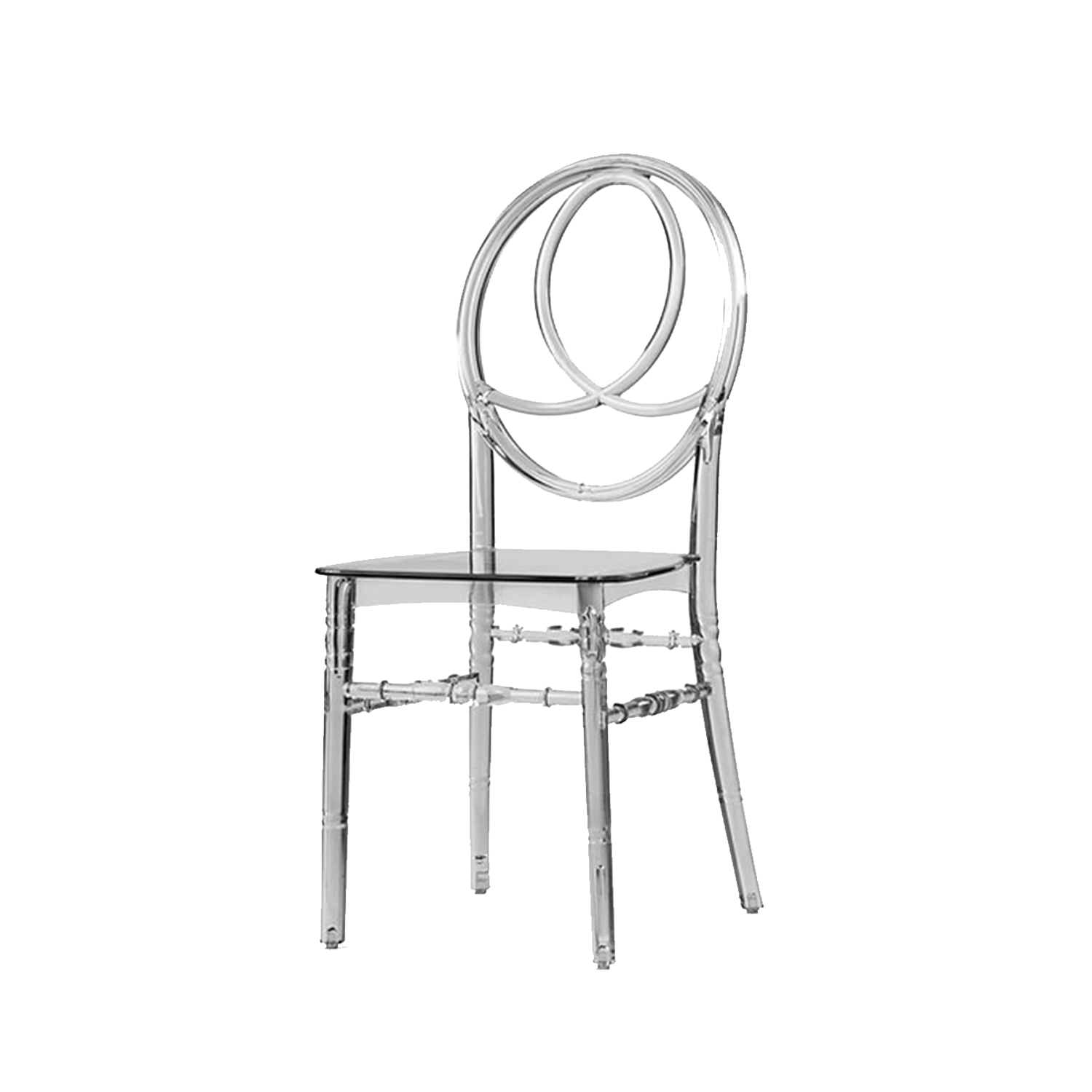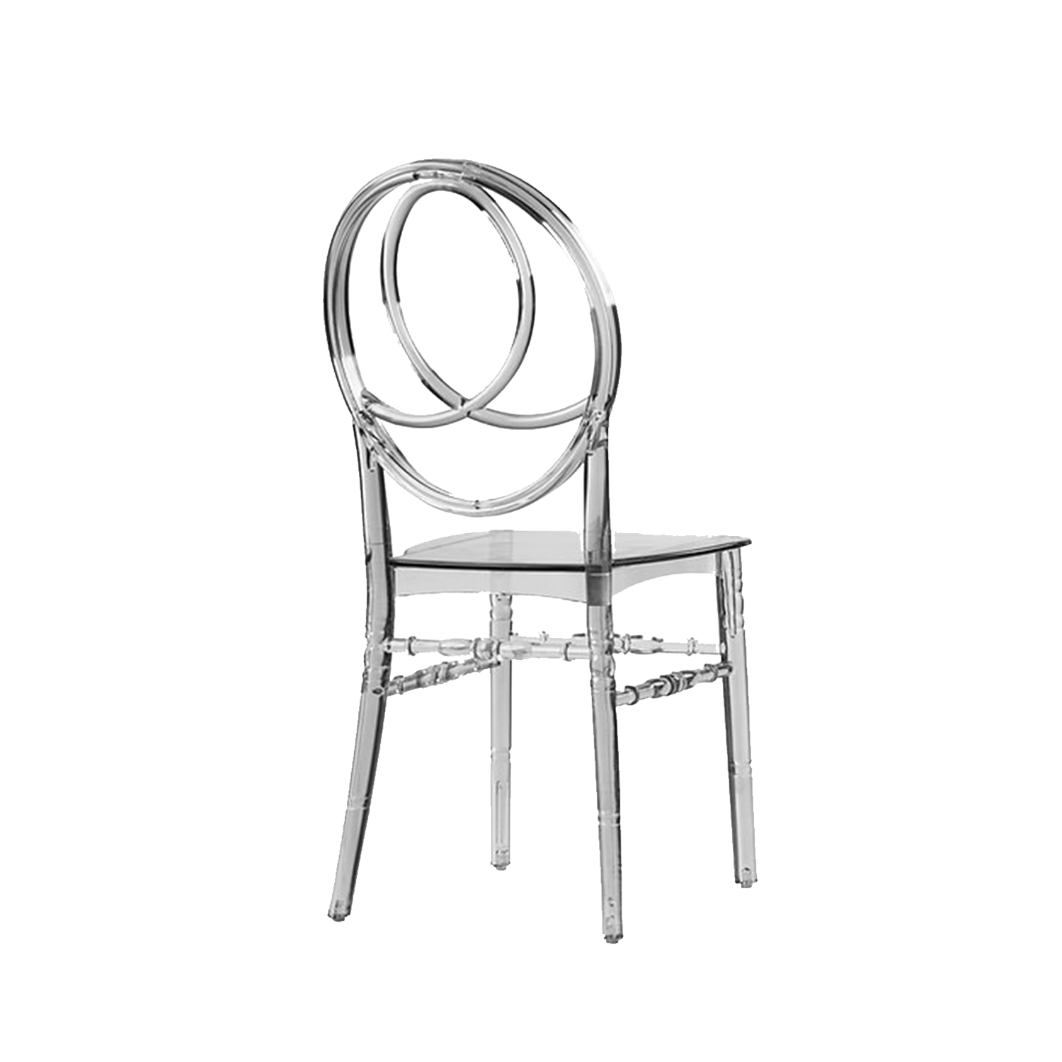Phoenix sandalye, arka kısmındaki iç içe geçmiş oval halka tasarımıyla klasik şeffaf sandalyelerden ayrılır. Bu özgün form, organizasyon alanına estetik bir derinlik kazandırırken fotoğraf ve video çekimlerinde son derece şık bir görünüm sunar. Masa düzenleri, çiçek aranjmanları ve ışıklandırmalarla birlikte kullanıldığında dekorasyonun bütünleyici parçası haline gelir.